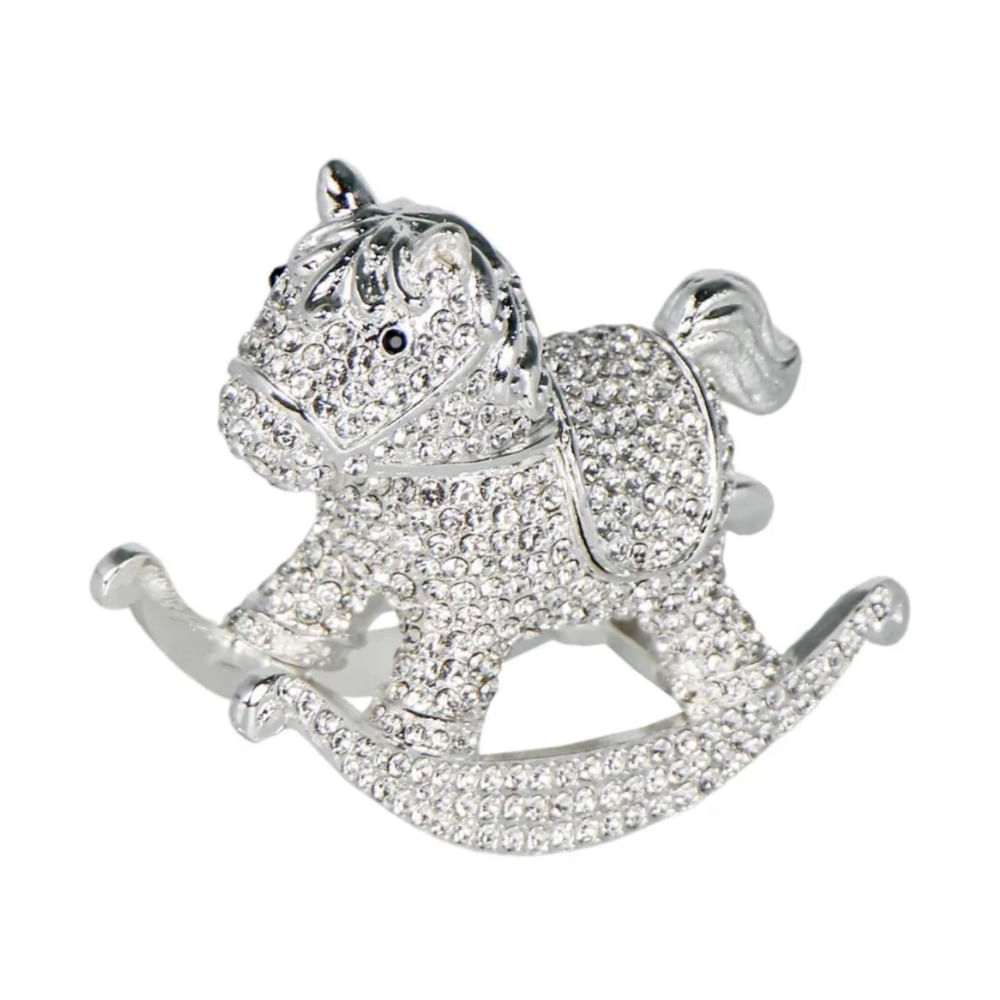 O Porta Dente e Cacho Cavalo de Balanço com Strass é uma peça encantadora e funcional, confeccionada em metal cromado de alto brilho, com interior pintado com efeito perolado e acabamento impecável. Os detalhes em strass agregam ainda mais sofisticação e delicadeza.