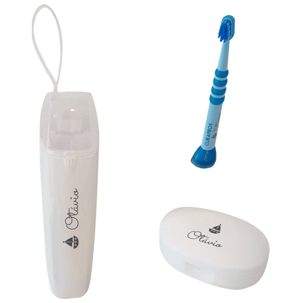 Kit Porta Escova + Saboneteira Branco + Escova Dentes 3 Anos Curakid Azul