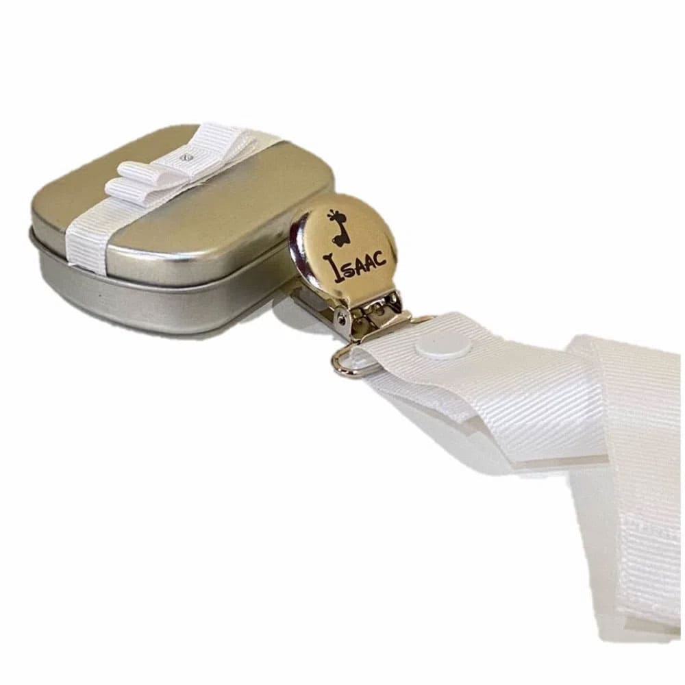 Prendedor Metal Prata TudoComNome - Fita Branca na Latinha